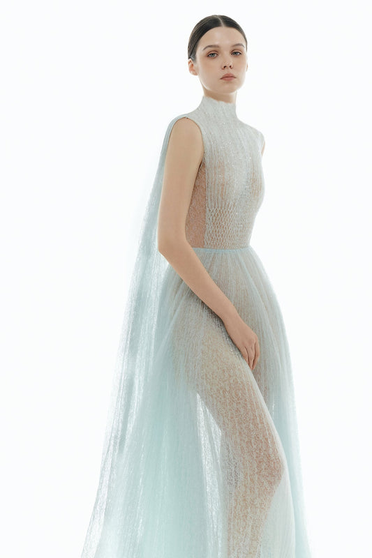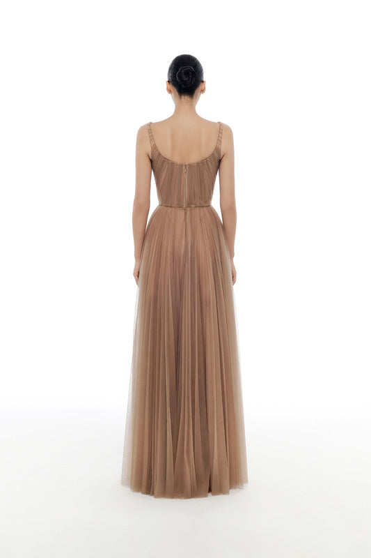 Montstand Brown& Cream& Green Draped Tulle Maxi Dress