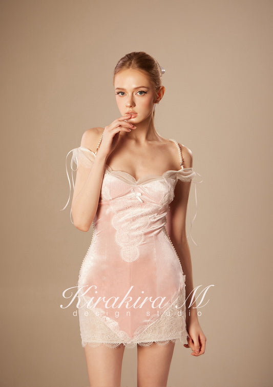 KIRAKIRA M Pink Velvet Patchwork Lace One-Shoulder Mini Dress