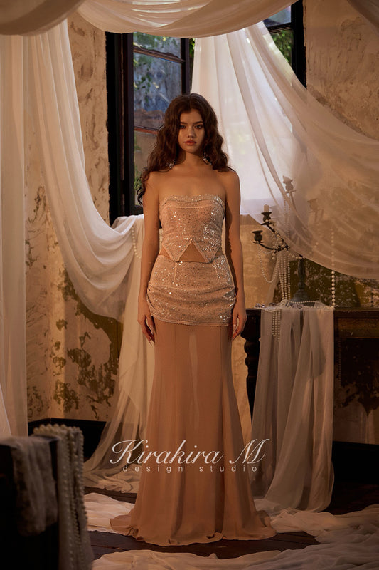 KIRAKIRA M Gold Strappy Sheath Top & Fishtail Halter long Skirt