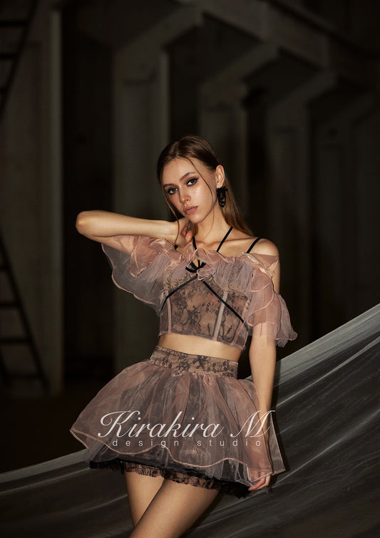 kirakira M Brown Nude 2 Wear Tulle Strappy Top Pom Pom Halter Skirt 2 Piece Suit