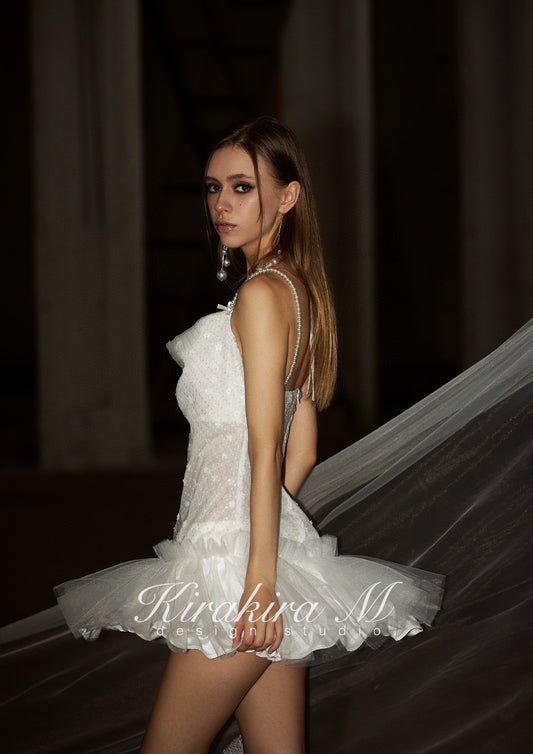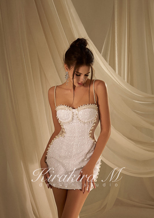 KIRAKIRA M White glitter strap mini dress with pearls deatail