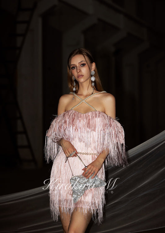 Kirakira M White Diamond Embellished Silver Glitter Patchwork Pink Strappy Fishbone Sheath Mini Dress with Bottom