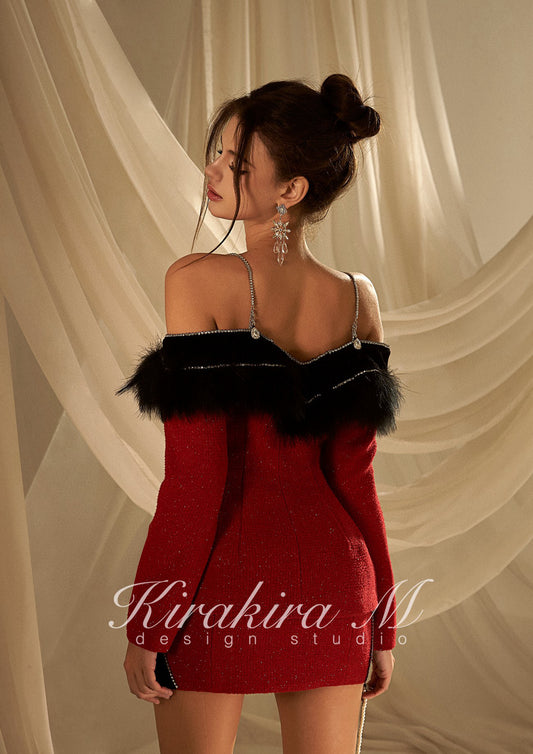 KIRAKIRA M Red tweed off shoulder coat mini dress with feather detail