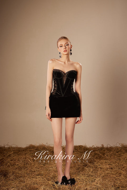 KIRAKIRA M Black Velvet Mini Dress (Free Bow Hairpin)