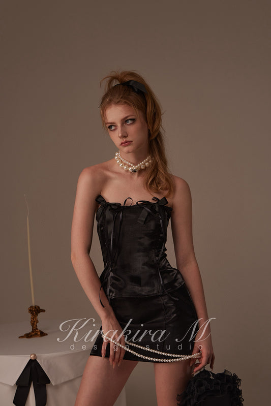 Kirakira M Black Glossy Bow Top & Low Waisted Wrap Hip Half Skirt