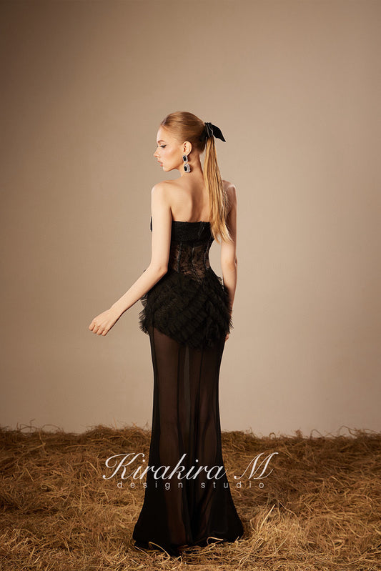 KIRAKIRA M Black Lace Shiny Diamonds Fishtail Fishbone Sheath MAXI Dress (Free Bow Hair Accessories)
