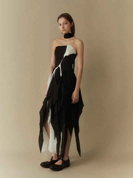ELYWOOD BLACK AND WHITE SEAMED GAUZE MIDI DRESS