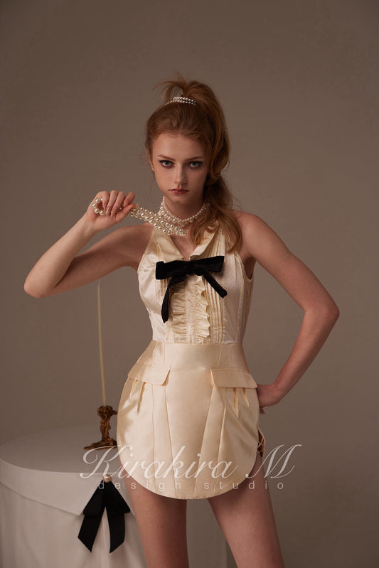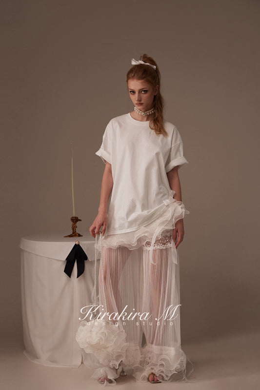 Kirakira M White & Black Bow Top& Lace Shorts& Lace Low Rise Pants
