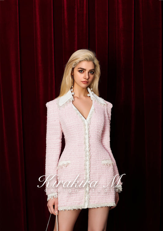 Kirakira M Pink Pearl Tassel Lapel Patchwork Tweed Mini Dress