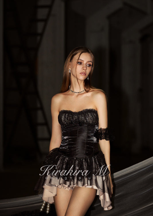 kirakira M Black Lace Camisole Tulle Puffy Top and Half Body Skirt 2 Piece Suit