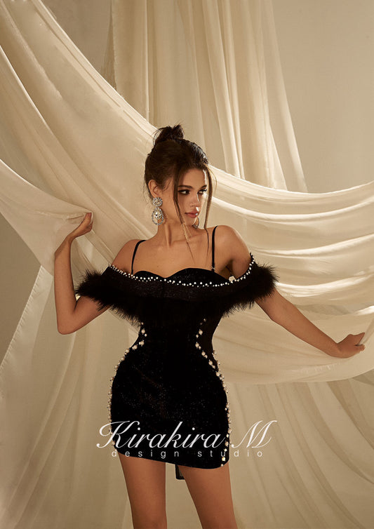 KIRAKIRA M Black velvet off shoulder mini dress with feather deatail