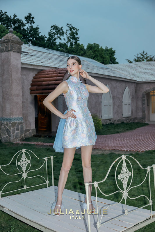 JULIA JULIE Blue Chinese jacquard dress with stand-up collar mini dress