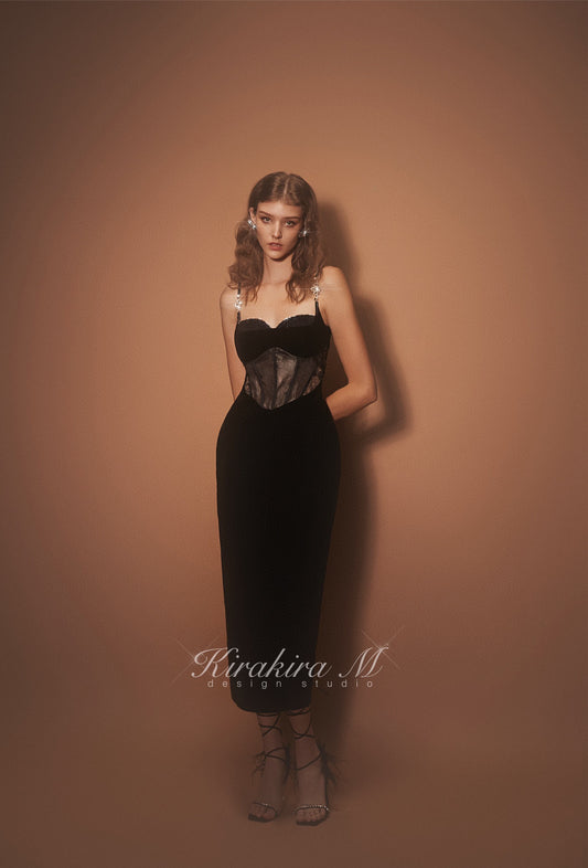 JULIA JULIE black birdcage styled velvet patchwork midi dress