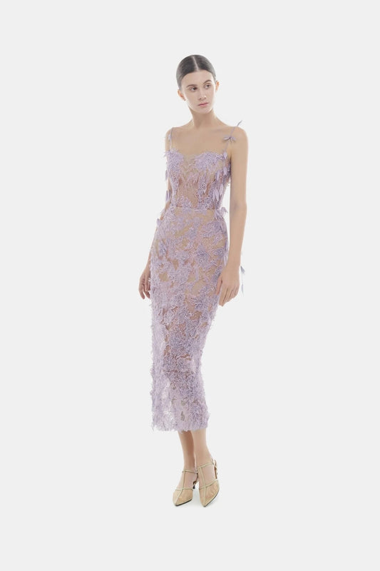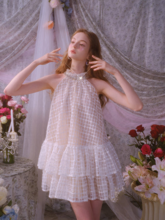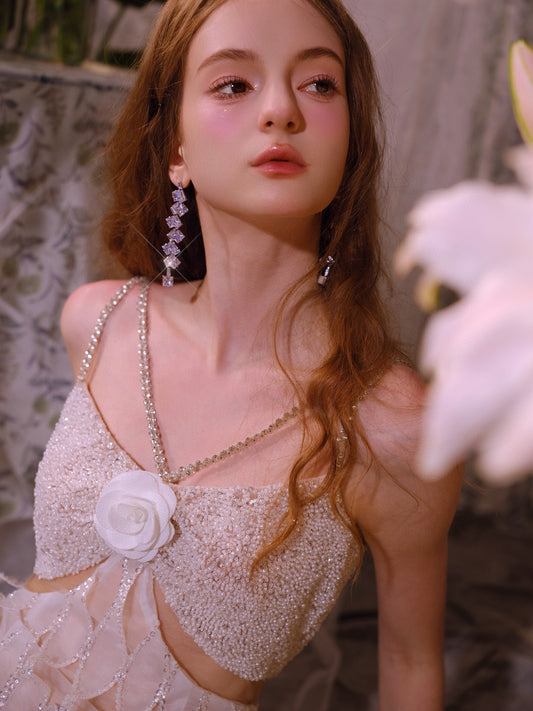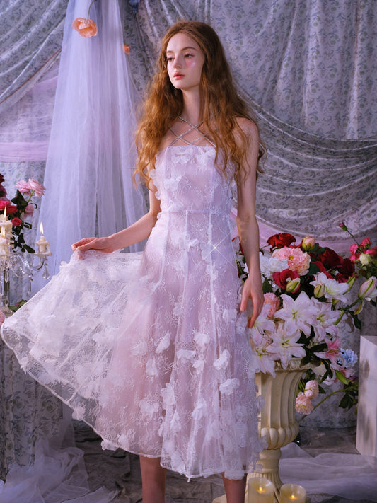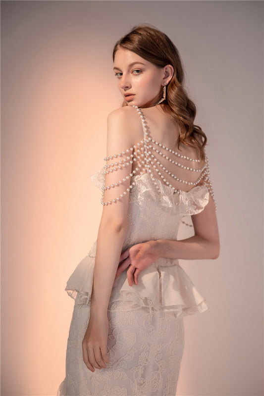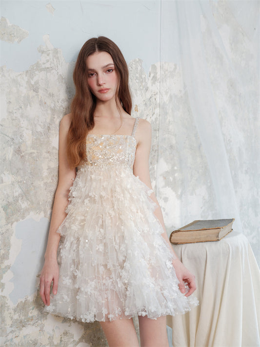 WARDROBE BY CHEN white rose-print lace and diamond chain-embellished mini dress