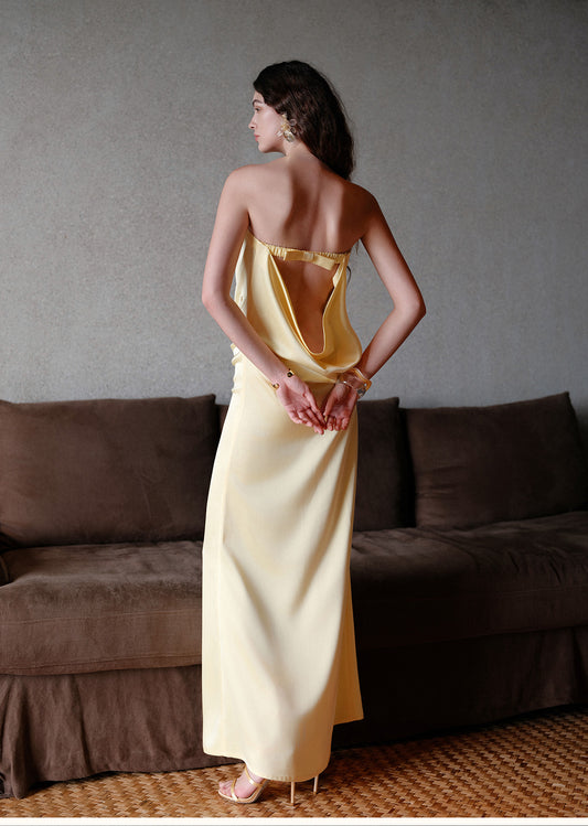 SheerLuck White & Yellow Aurelia Double-sided Satin Bustier Bow Backless Maxi Dress