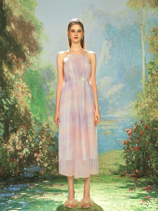 KINGWEN pink & white chiffon pressed pleated backless maxi dress