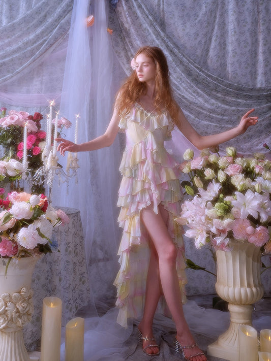 KINGWEN pink floral chiffon ruffle cut-out mini dress
