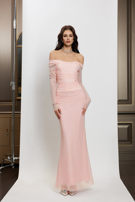 SHEERLUCK Pink & Nde & Brown Fishbone maxi dress