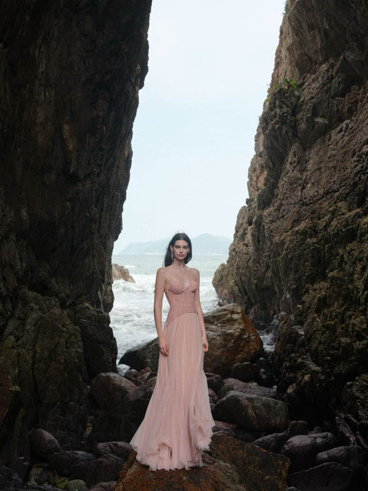 SHEERLUCK White& Pink Wave Lace Fishbone Maxi Dress