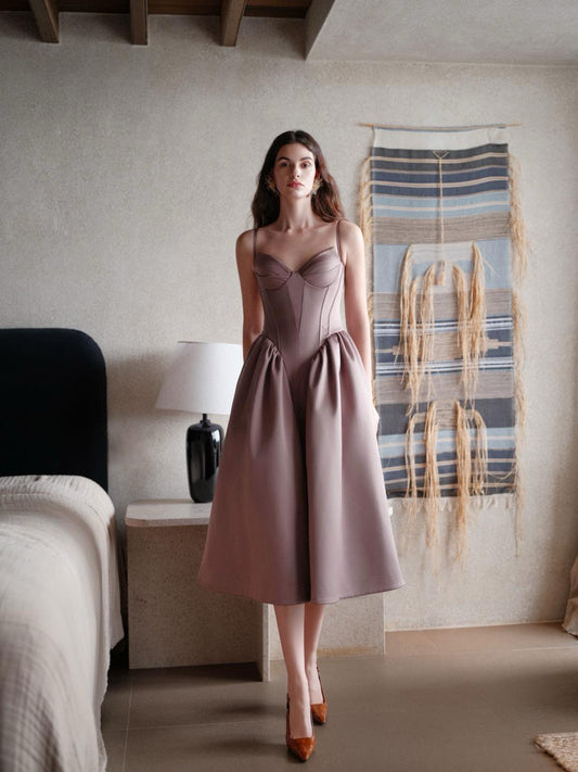 SHEERLUCK Brown & WHITE Mirri Cubic Cut Satin Midi Dress