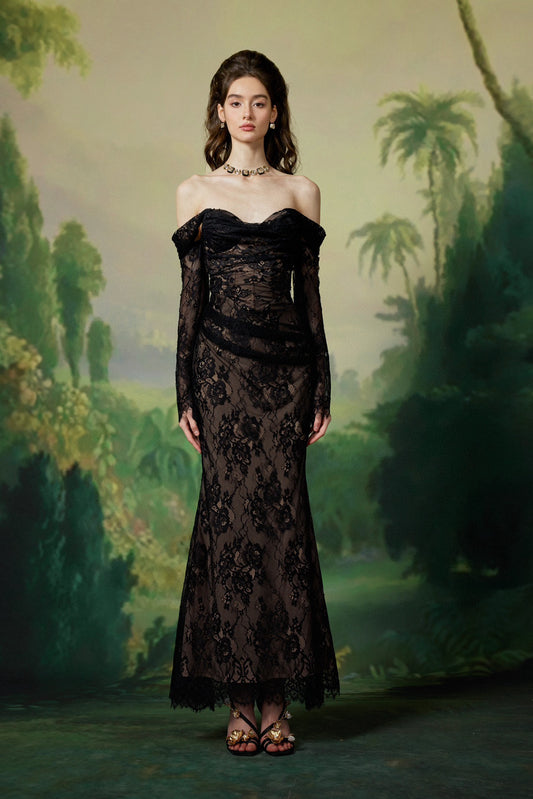 SHEERLUCK Black| White Lace fishtail skirt with fishbone maxi dress