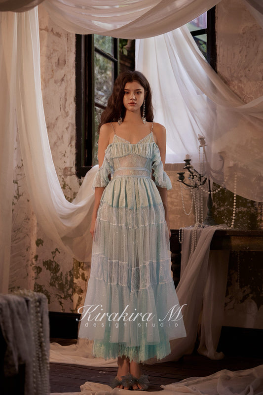 KIRAKIRA M Blue Diamond Embellished Feather Lace Extra Maxi Dress + Bottoms (Slightly Sheer)