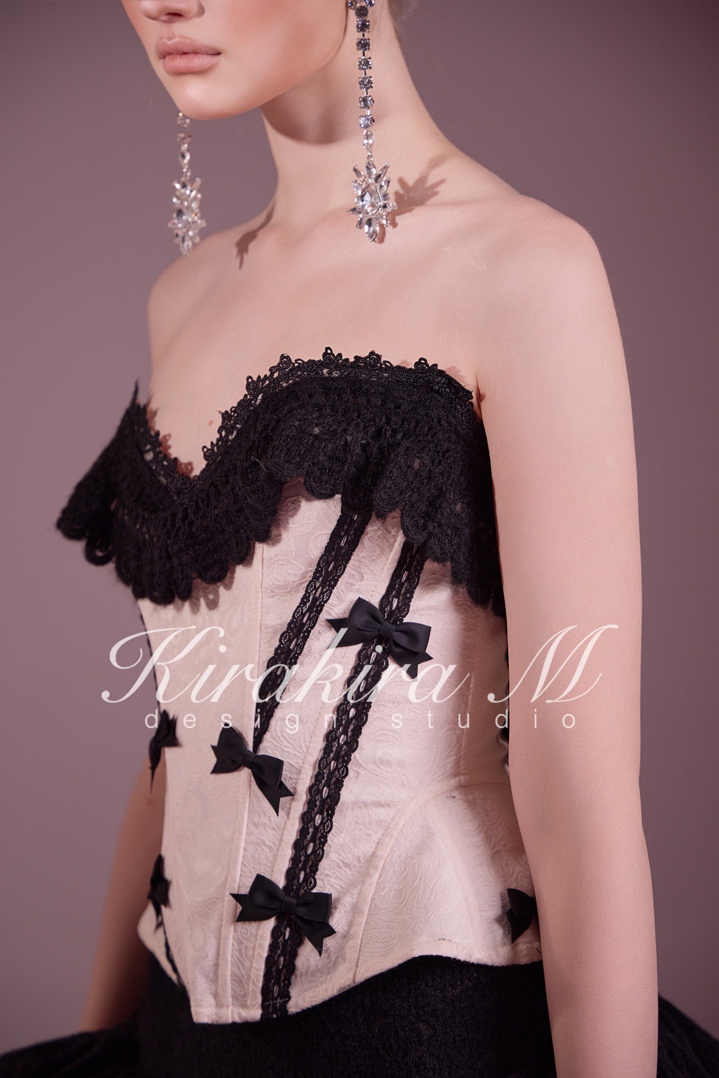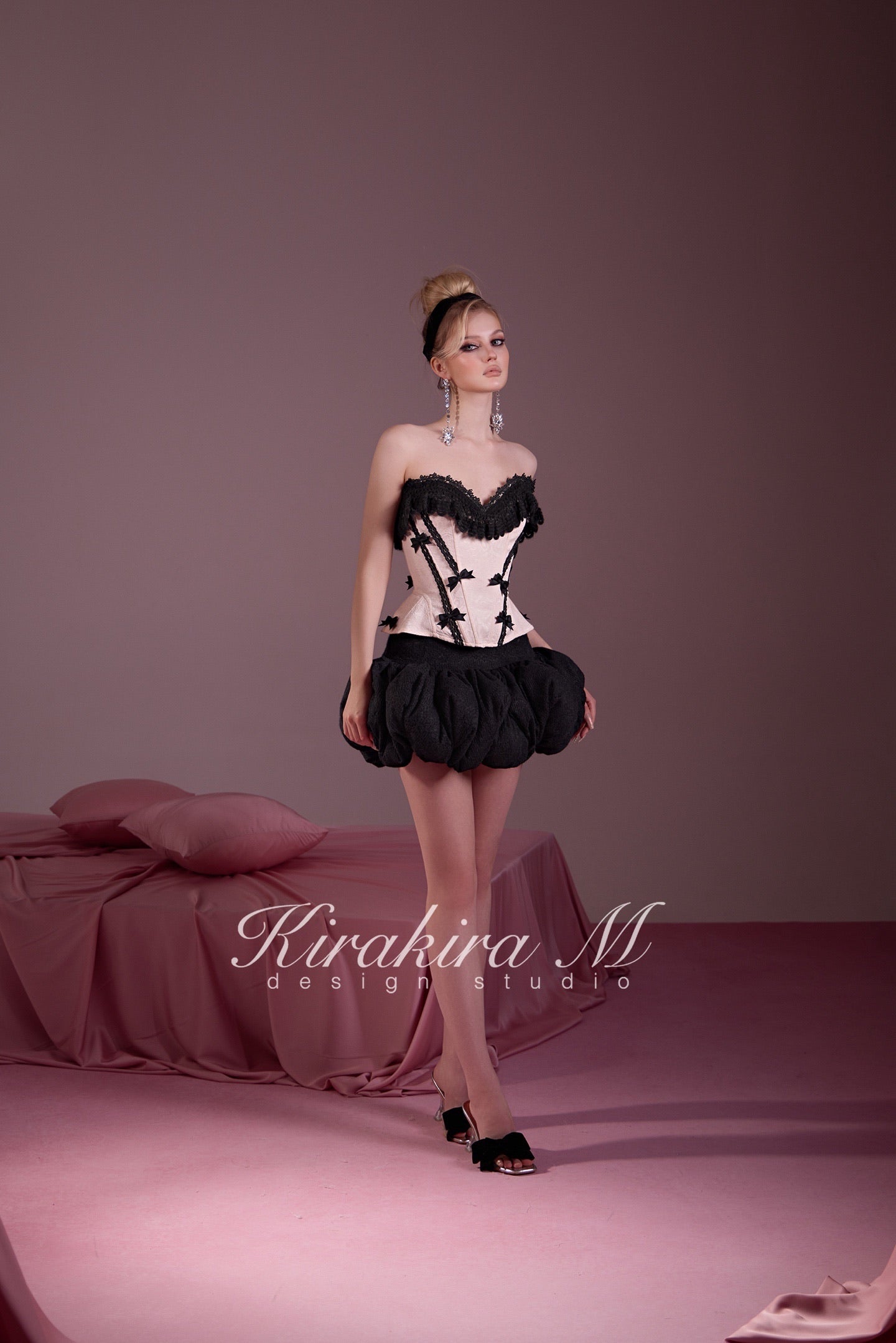 KIRAKIRA M Pink Cinched Waist Drawstring Top & Black Knitted Low-Waisted Bubble Skirt