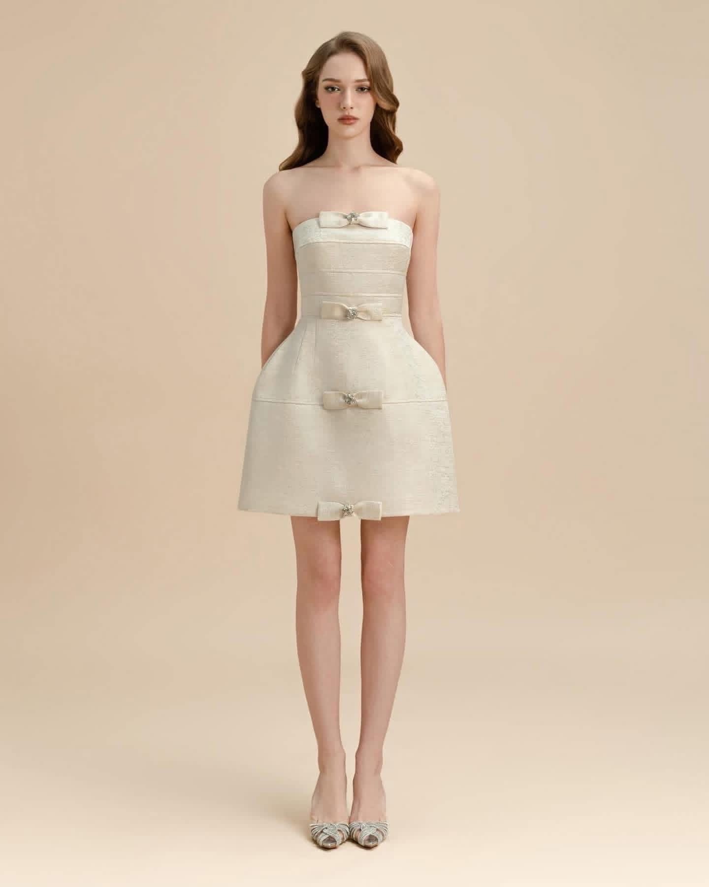 LAMORIS White Pearl Stone Bow Mini Dress