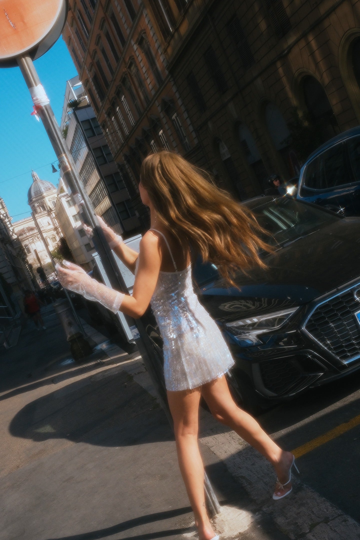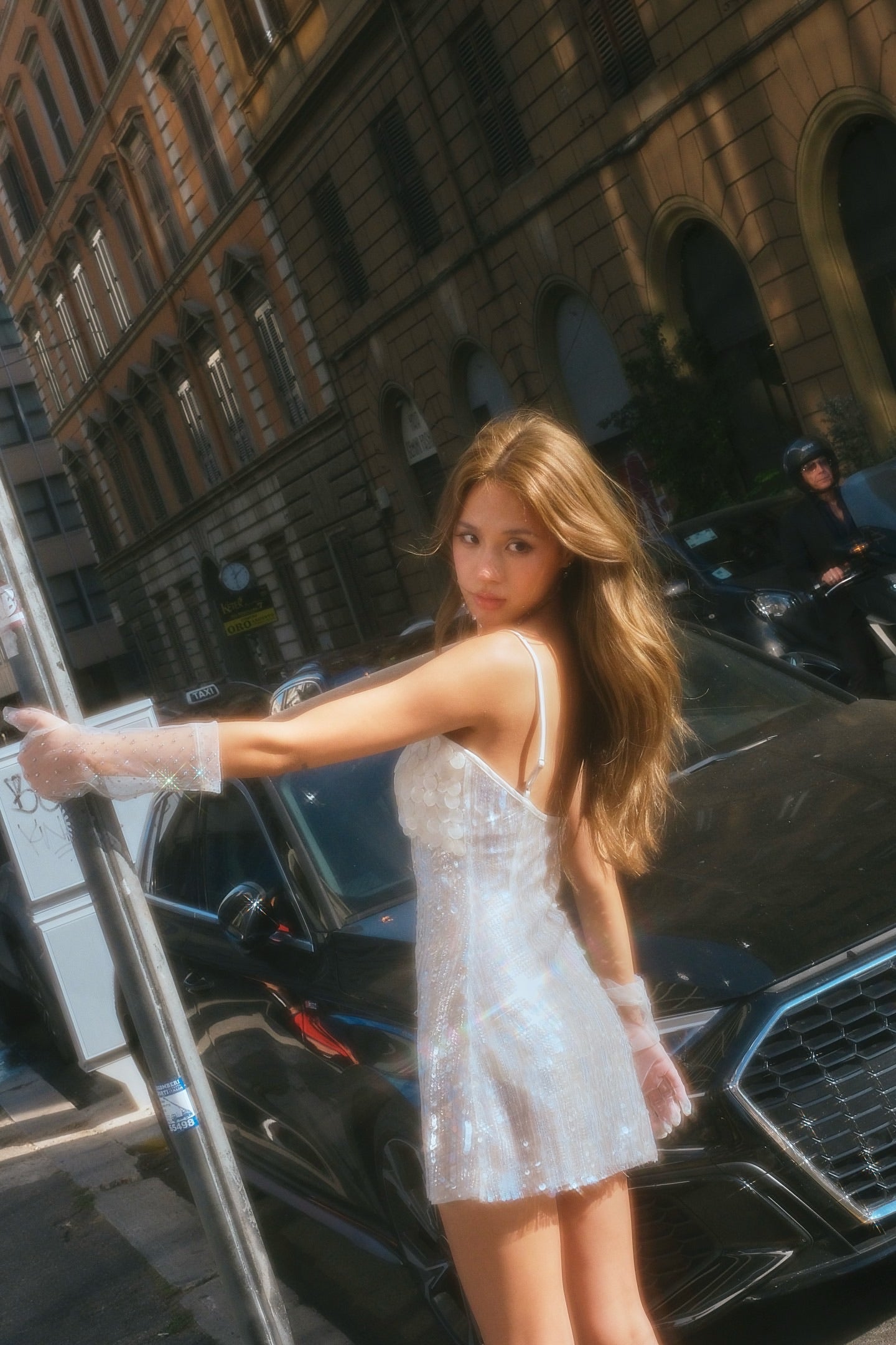 MINPURA White Roma Pearl Patchwork Sequined Strapless Mini Dress
