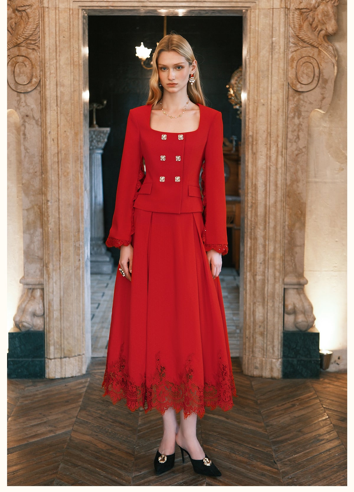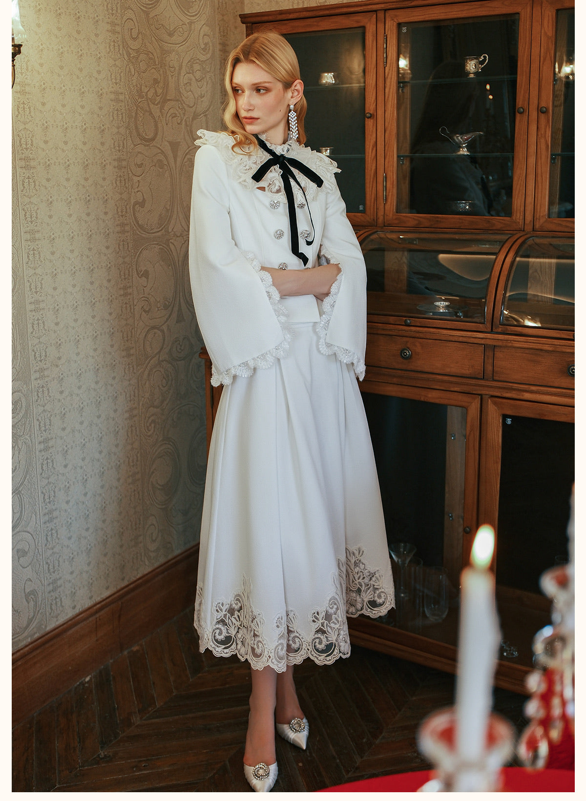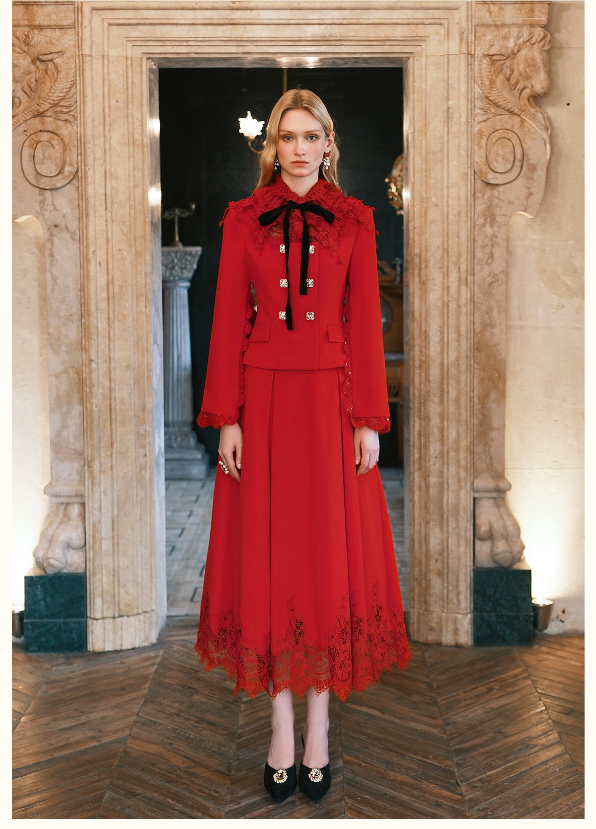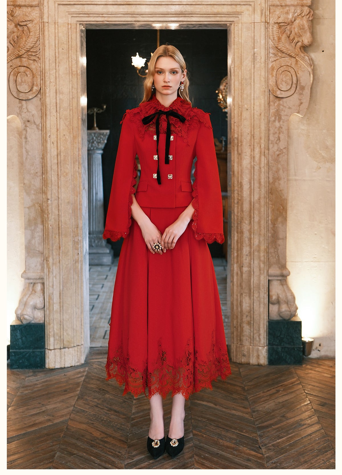 SHEERLUCK Black Mirage Vintage Stand Collar Lace & Diamond-embellished Jacket & Skirt