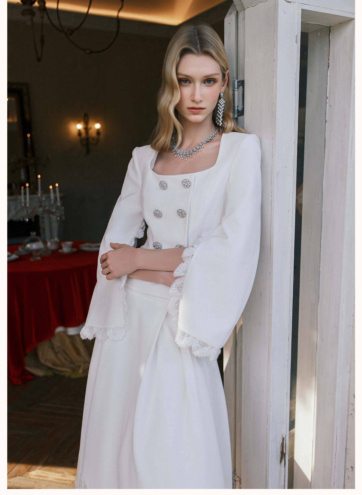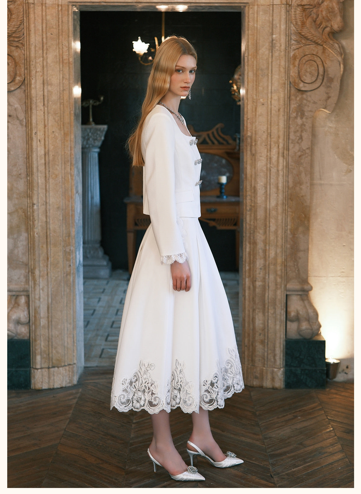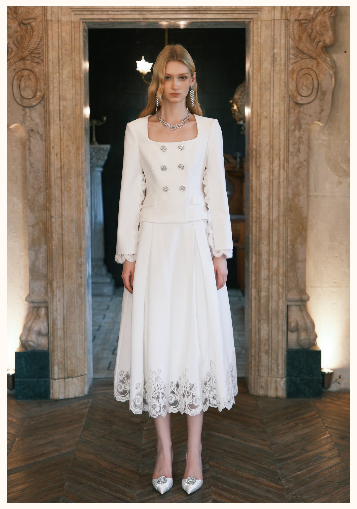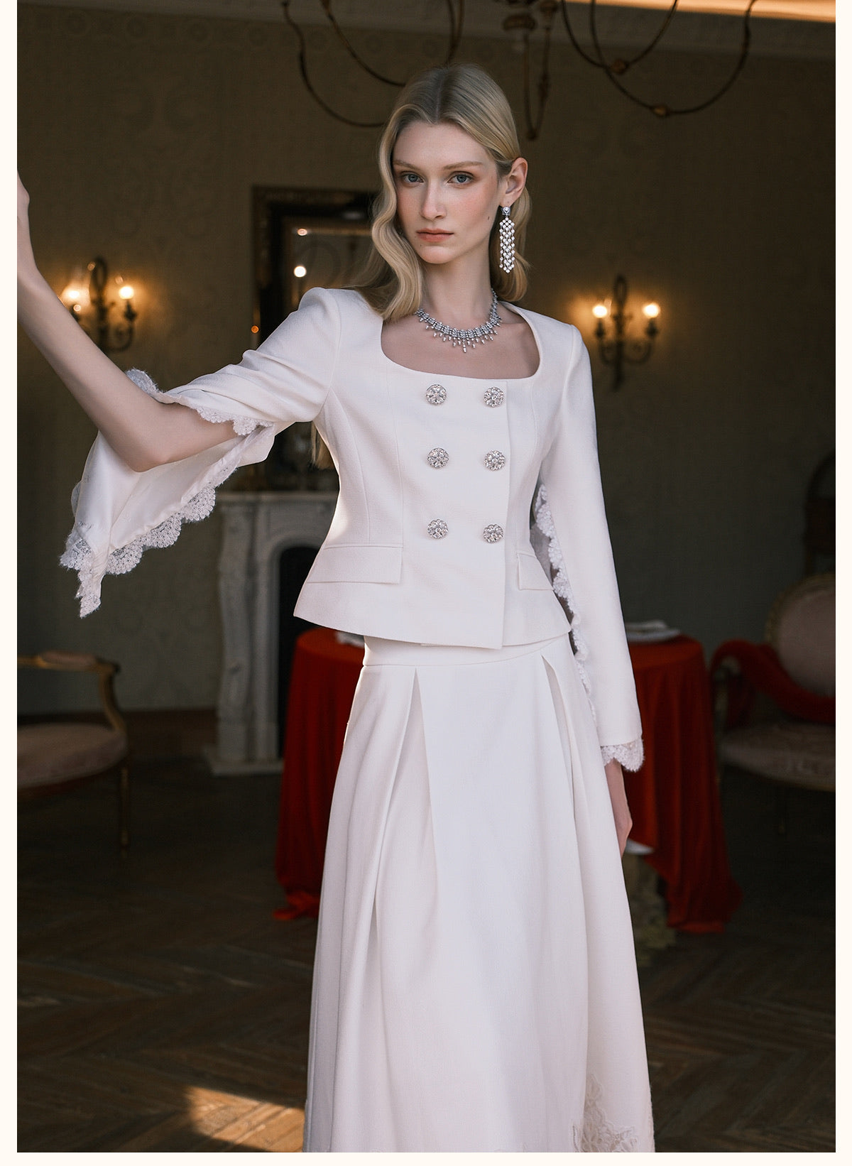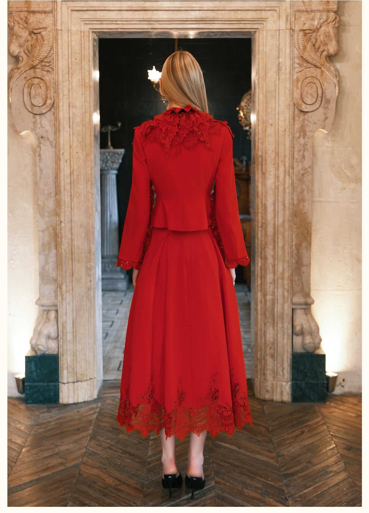 SHEERLUCK Black Mirage Vintage Stand Collar Lace & Diamond-embellished Jacket & Skirt