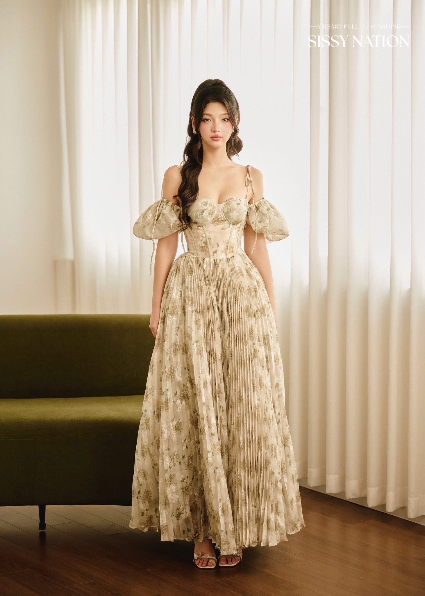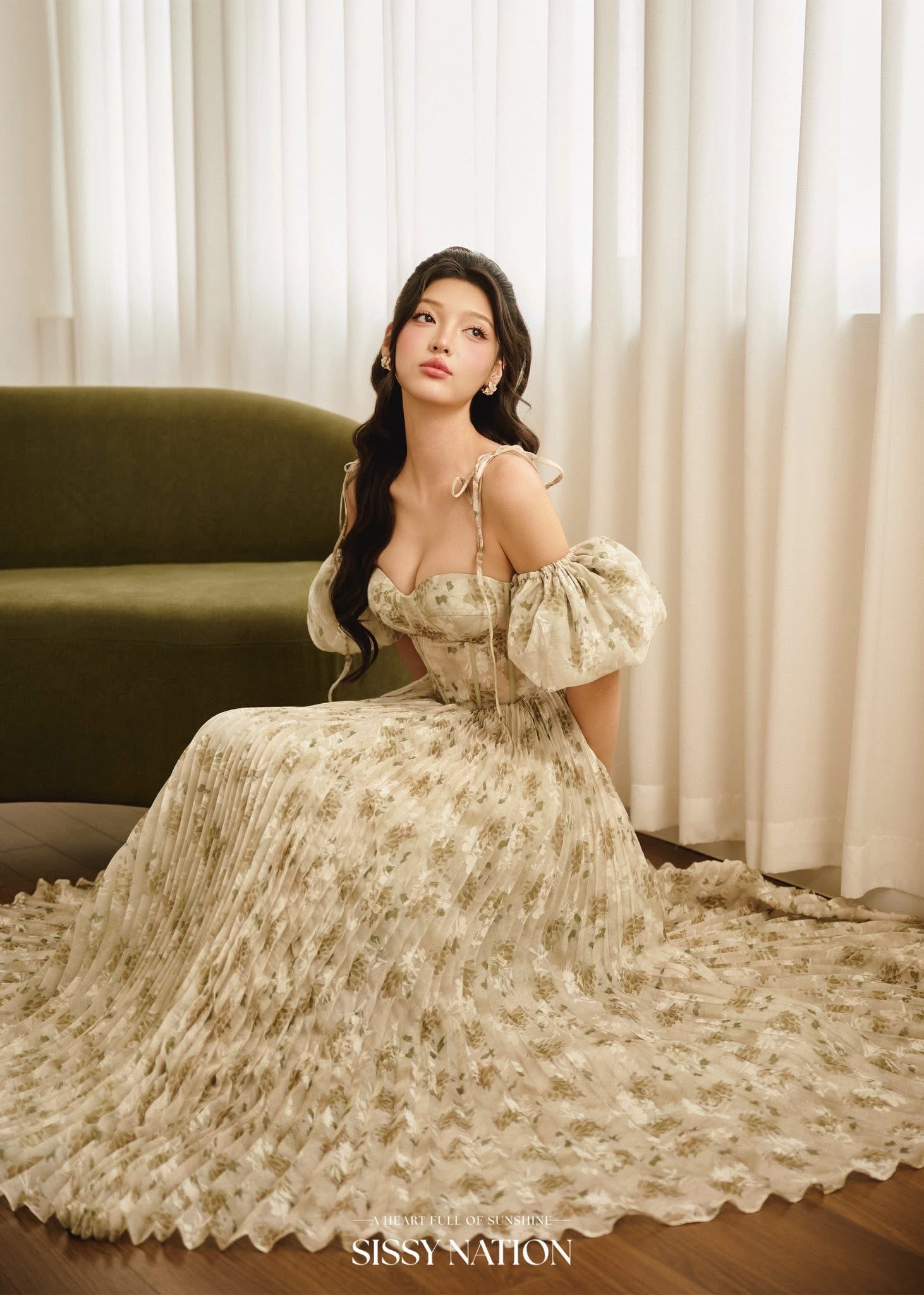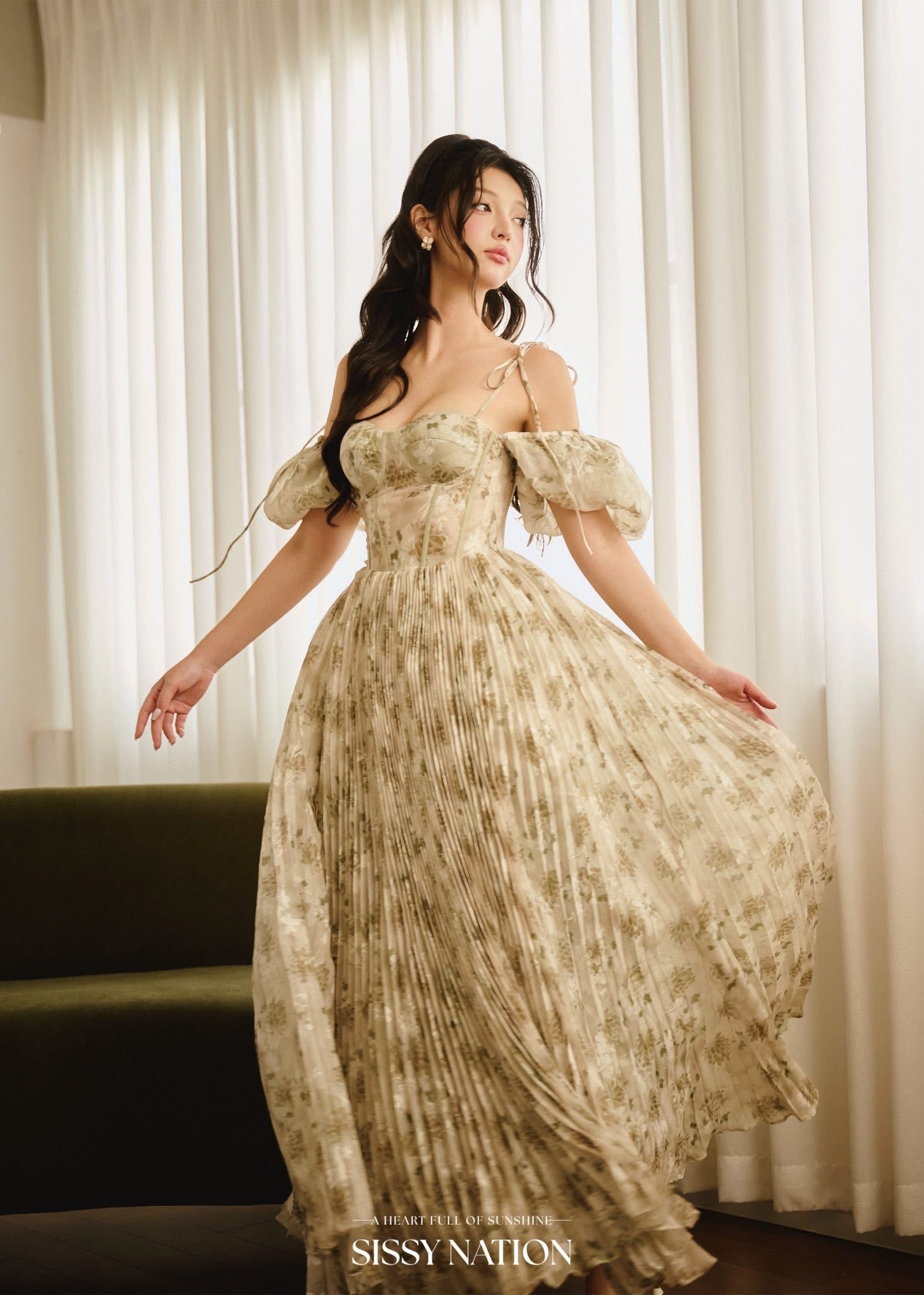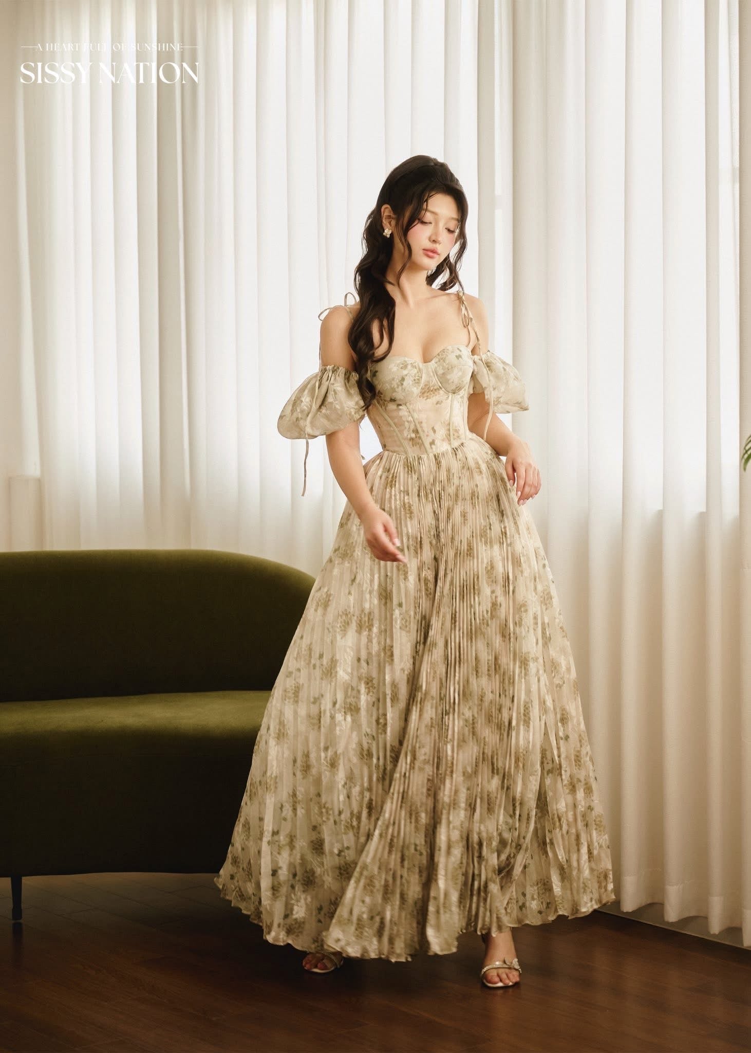 SISSY NATION Green Floal Tiana Pleated Maxi Dress